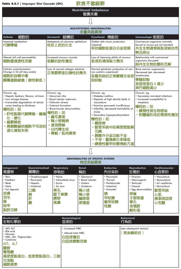 g. 疑似患有鐵蓄積症(Iron storage disease)的鳥兒:避免攝取柑橘類的食物、番茄、奇異果、草莓及其它含有維生素C的食物。避免鐵含量高的葡萄、紅醋栗、肝臟、紅肉、蛋黃、深綠色蔬菜如菠菜。(適用於高能、日常保健與辣椒配方)